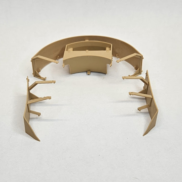 As with the hull schurzen the turret brackets were fixed to the panels first to get a nice clean fitment. As there is very little room between both the rear curved panel and the turret bin these areas will require an airbrushed shadow coat before final fixing to the turret. Photoetch storage trays at the rear of the schurzen are added by way of either plastic or PE brackets. As they would be hardly visible, I opted for the more durable plastic option and thinned them down.